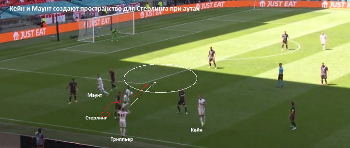 Вот еще один пример из этого же матча. Снова Маунт и Кейн смещаются к флангу, Триппьер бросает в свободную зону, в которую уже мчится реактивный Стерлинг. Только после пары аутов Англия реально могла забить два гола.