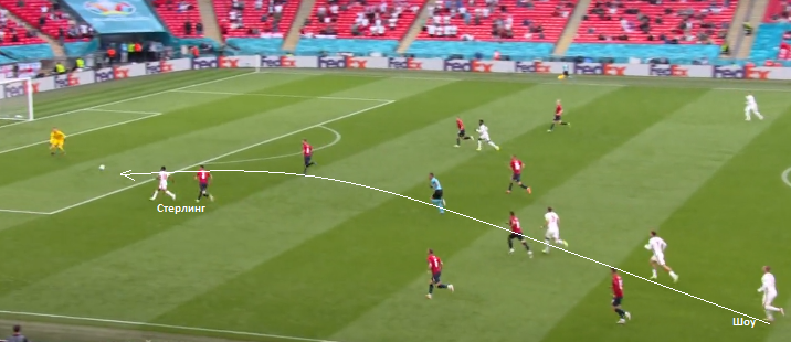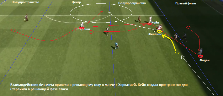 Хорваты, стандартно накрывали оппонентов, но даже не подозревали, что попали в ловушку. Триппьер выбросил мяч в зону, которую старательно освобождали Кейн, Маунт и Стерлинг. Автоматически, Стерлинг атакует пространство, оказывается первым на мяче и стремительно рвется к воротом. Умными действиями без мяча в середине поля, игроки сборной Англии в безобидной ситуации создали фазовое пространство в финальной трети. Стерлинг своевременно в динамике отдал в правое полупространство на Фодена и то попал в штангу.