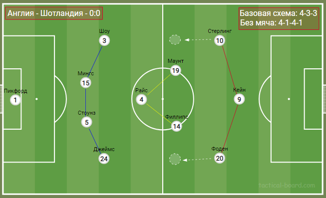 В этом поединке англичане не имели даже качественного стартового отрезка. Шотландия пыталась высоко прессинговать, а у хозяев поля куда-то пропала АПЛ-овская интенсивность. Шотландия играла по схеме 3-4-1-2, по сути отзеркалив структуру соперника, что способствовало практике персонально – ориентированного прессинга. Судя по всему, именно этот аспект и нивелировал разницу в потенциале команд.