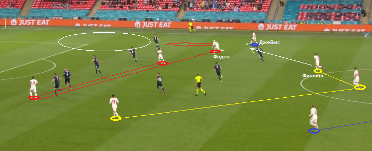 Нужно отметить распространенную комбинацию с передачей на третьего. Часто, если следует пас вперед на игрока атакующей группы, его сосед по вертикальным зонам начинает стремительно открываться в глубину На скриншоте выше — пример подобного взаимодействия. Когда Филлипс отдал короткий пас на Джеймса, Фоден моментально пошел в атаку пространства за спинами шотландских защитников. Даже, если заброса не последует, условный Фоден открывает пространство для продвижения условного Джеймса.