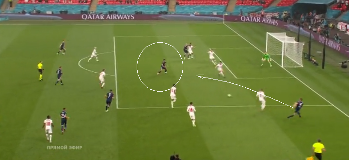 И еще один момент из матча с хорватами на который необходимо обратить внимание – даже при стандартах, англичане создавали пространство для Стерлинга. Подборы, особенно в зоне 14 очень важны в матче с Англией. Можно сколько угодно смеяться над скучным, усыпляющим футболом Саутгейта, но, нужно признать, что пока он достаточно эффективен. Да, Англия играет крайне осторожно, потенциал игроков группы атаки не реализовывается (кроме Стерлинга, разумеется), но при этом каждый аут, штрафной, угловой или заброс несут в себе реальную угрозу. К тому же, убаюкивающая игра англичан частенько прерывается взрывом активности. В этом плане, в основном угроза исходит снова-таки от Стерлинга.
