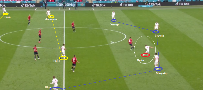 Опорную зону контролировал одноклубник Андрея Ярмоленко – Деклан Райс. Функции инсайдов были возложены на Маунта и Филлипса. Номинальными инвертированными вингерами, которые активно смещались в другие вертикальные зоны, были Стерлинг и Фоден. На острие атаки действовал Кейн.