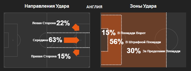 Англия отличилась достаточно рафинированным контролем мяча, который часто завершался длинными передачами и забросами за спины шотландским защитникам. Также, следует отметить, "центрофобию" Саутгейта. Он всегда старается избегать развития атак через центр, особенно это проявлялось в игре с соседями. В этой вертикальной зоне было зафиксировано всего 20% от всех активных действий англичан. Снова акцент был сделан на левый фланг, где активничал Стерлинг. Переводы с фланга на фланг в основном осуществлялись неэффективным "дедовским", но в то же время – наиболее осторожным способом – короткими и средними передачами через центральных защитников.