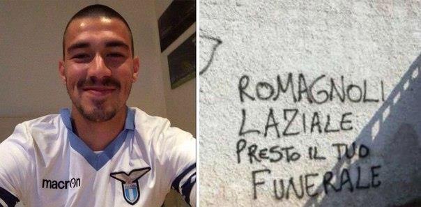 Отут, наприклад, романісти залишили біля римського дому футболіста цілком зрозумілі слова: "Romagnoli Laziale presto il tuo funerale", що коротко і ясно демонструє анонс похорону...