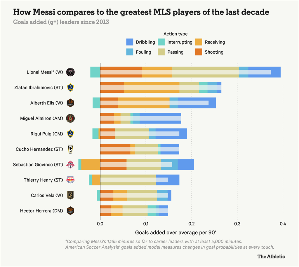 Єдина найбільш корисна цифра для підсумовування бурхливого темпу Мессі в МЛС – це не голи чи результативні передачі (у яких він лідирує) і навіть не очікувані голи без пенальті плюс очікувані результативні передачі за 90 хвилин (так, це також лідерство), а більш цілісна ймовірність голу — модель American Soccer Analysis під назвою додані цілі. Щоразу, коли гравець торкається м’яча, додані голи вимірюють шанси його команди забити або пропустити до та після дії та зараховують йому різницю, підсумовуючи всі його внески в м’яч у термінах очікуваної різниці м’ячів.