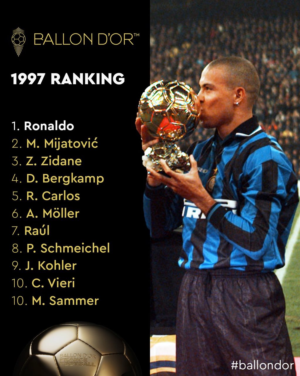 Насправді Fenômeno міг отримати свій перший Золотий м’яч ще у 1996-му, коли став гравцем року за версією ФІФА, але тоді нагороди ще не були об’єднані.