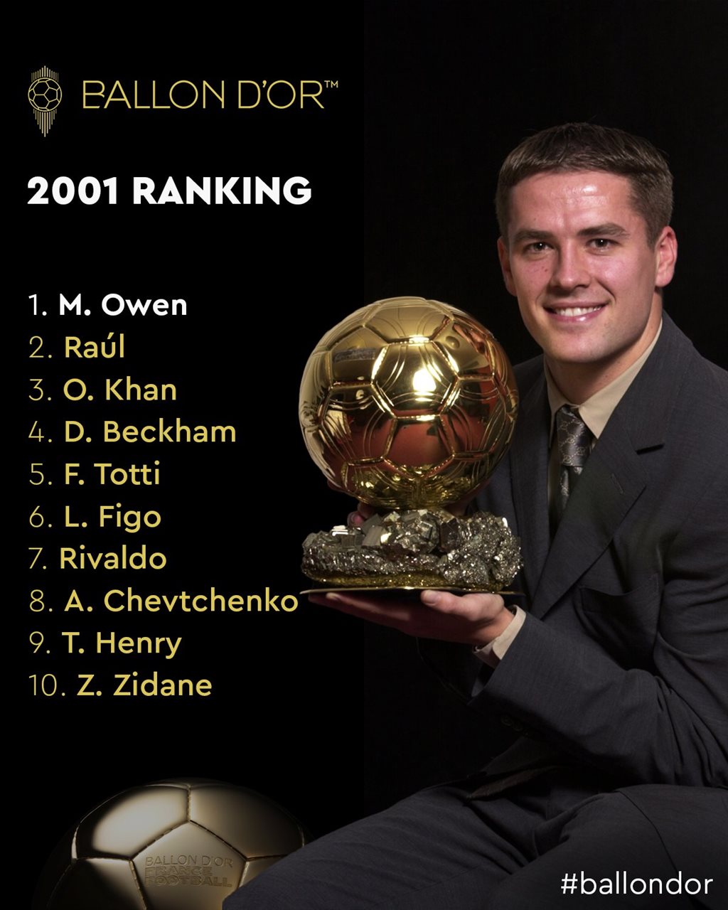 Оуен досі зберігає статус другого наймолодшого володаря нагороди після вибухового старту кар’єри наприкінці 1990-х і фантастичного 2001 року. Того сезону він допоміг"червоним" здобути "малий требл" – Кубок англійської ліги, Кубок Англії та Кубок УЄФА. Оуен завершив сезон найкращим бомбардиром клубу – 24 голи.