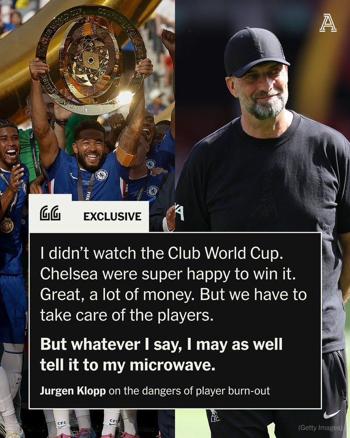 "Що б я не сказав, я міг би розказати це своїй мікрохвильовці", — каже Клопп. "Це має точно такий самий ефект. Люди скажуть: "О, але ти заробляєш багато грошей!" Дякую, я знаю. Або офіційні особи клубів скажуть: "Так, це гравці та тренери, вони завжди хочуть більше грошей, тому нам потрібно заробляти ці гроші". Тоді чому б не зібратися всім разом за столом і не сказати гравцям, що вони можуть мати вісім тижнів відпустки на рік? Чи можемо ми поговорити (про те, як ми до цього дійдемо)? Спробуйте! Чи дійсно їм так потрібен той зайвий мільйон від тих нововведень?"