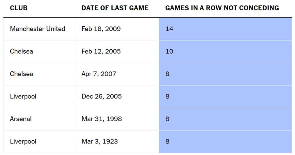 Найбільша кількість послідовних "сухих" матчів у вищому дивізіоні Англії