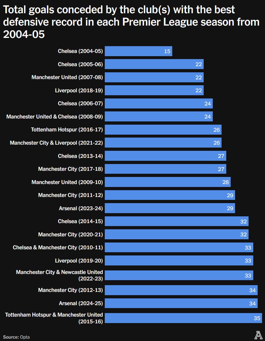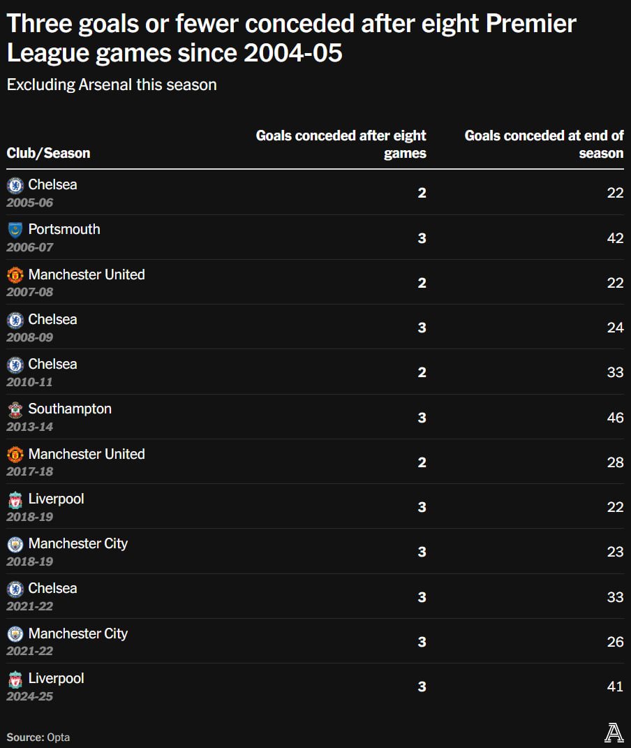 З сезону-2004/05 13 команд (включно з Арсеналом у 2025/26) пропустили три голи або менше після восьми ігор кампанії Прем’єр-ліги. Ось інші 12 і кількість голів, які вони пропустили після всіх 38 матчів.