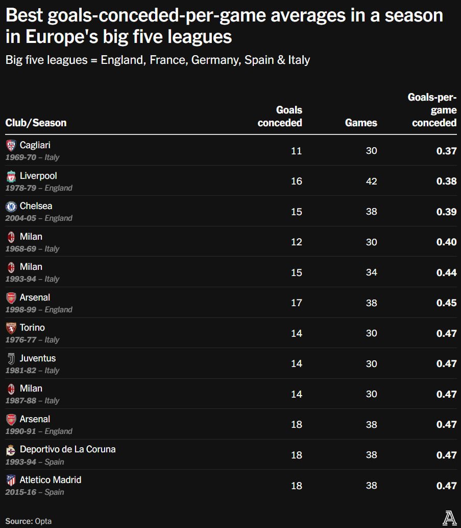 Арсеналу потрібно пропустити 13 голів або менше в Прем'єр-лізі цього сезону, щоб побити абсолютний європейський рекорд Кальярі.