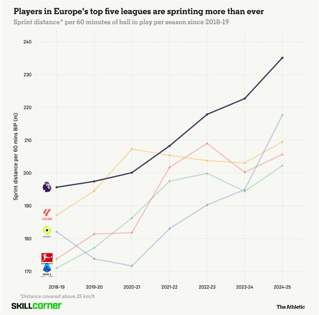 *Ця інфографіка показує, як змінювалась середня дистанція спринтів (біг зі швидкістю понад 25 км/год) у п’яти провідних футбольних лігах Європи — АПЛ, Ла Лізі, Бундеслізі, Серії А та Лізі 1 — із сезону 2018/19 до 2024/25. На графіку видно, що гравці стали бігати швидше та інтенсивніше, ніж будь-коли раніше. Особливо виділяється Англійська Прем’єр-ліга — з кожним сезоном показник дистанції спринтів стабільно зростає, досягаючи рекордного рівня у 2024/25. В інших лігах також спостерігається поступове підвищення, але не настільки виражене.