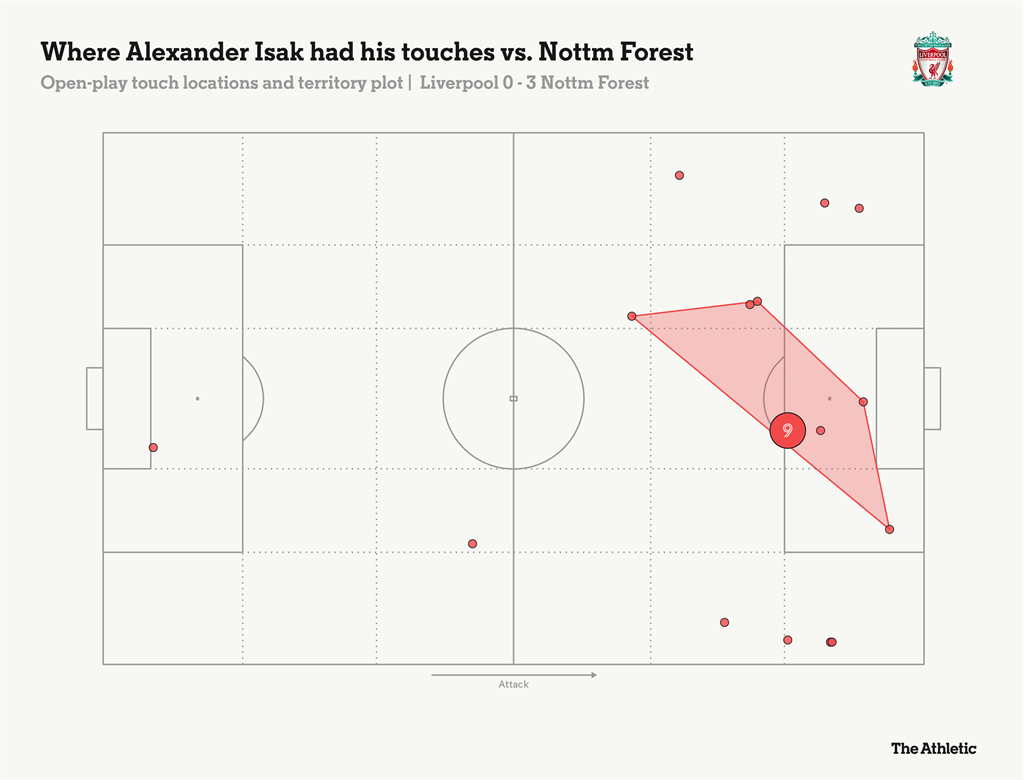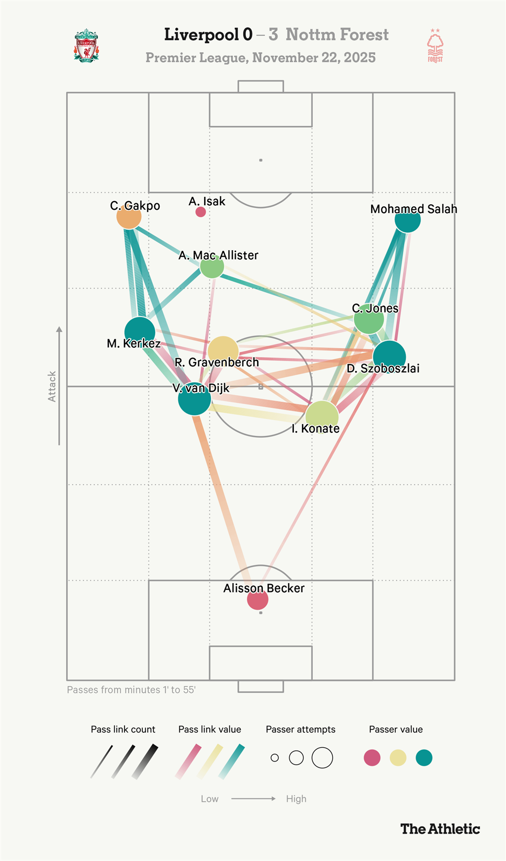 Графіка передач Ліверпуля з того матчу чітко показує: у команді відсутні зв’язки між нападниками. Подібні схеми інколи трапляються й з Ерлінгом Галандом у Манчестер Сіті, навіть у матчах, де він забивав по два-три м’ячі. Але зовсім не таким Ліверпуль бачив Ісака. Він, як і Екітіке, мав стати не лише більш стабільним бомбардиром, ніж Дарвін Нуньєс, а й гравцем із тонким розумінням комбінацій, який підсилює побудову атак.