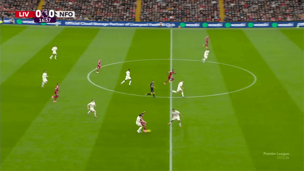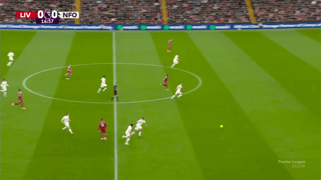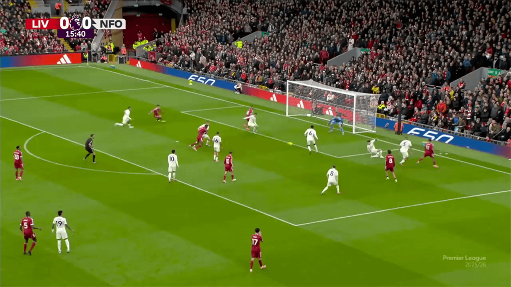 Яскравий приклад — епізод на 17-й хвилині. Спершу все виглядало ідеально: Ісак відтягнувся глибше, зіграв у стінку під тиском Міленковича й рвонув уперед, очікуючи пас у розріз. Це рух, який ми часто бачили у Ньюкаслі, а передача, яку Мохамед Салах раніше виконував майже бездоганно.