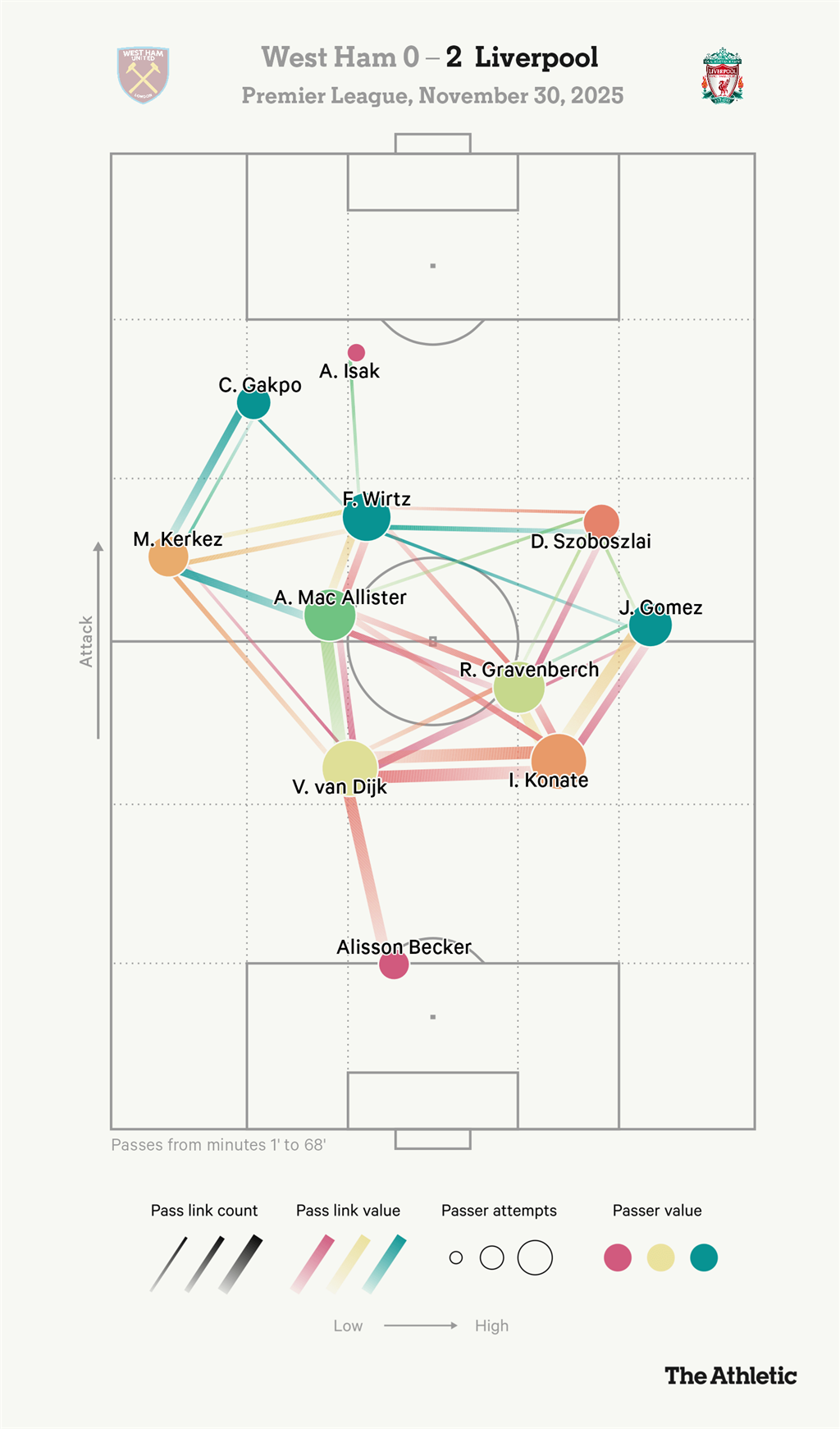 Попри те, що слабкість гри Вест Гема теж не можна ігнорувати, Ліверпуль виглядав більш цілісним і збалансованим, ніж у більшості матчів сезону. Собослаї, який загалом є одним із найкращих гравців кампанії, провів відносно непомітний матч — але саме тому, що його роль дала змогу Вірцу розкритися на повну.