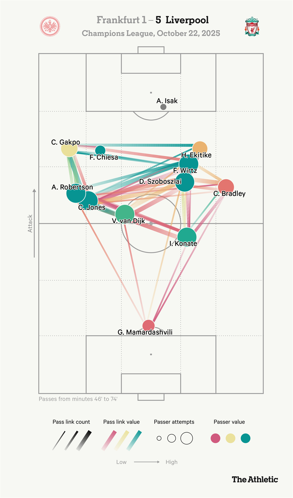 Карта передач показує, що структурно матч у Франкфурті був схожим на гру з Вест Гемом: Віртц активно зміщувався всередину, а правий захисник підключався високо вперед.