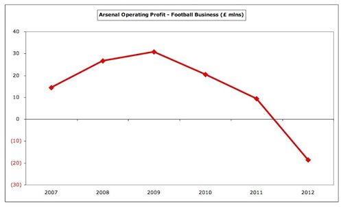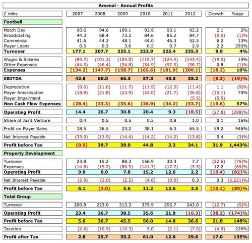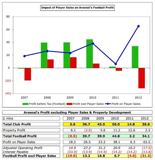 До сих пор прибыли Арсенала очень зависели от продаж футболистов и, в меньшей степени, недвижимости. Если же исключить доходы от развития собственности (£2,5 млн) и продажи игроков (£65,5 млн), в сезоне 2011/12 клуб из Северного Лондона потерял бы внушительную сумму - £31,3 миллиона.