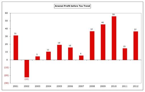 Канониры неизменно входят в число самых прибыльных клубов в мире, хотя и не являются лидерами по заработкам. Так, оба испанских гранда сообщили о больших доходах по итогам сезона 2011/12 - Барселона заработала 41 млн фунтов, Реал - 27 млн. Более того, мюнхенская Бавария находится на уровне самоокупаемости уже девятнадцать лет подряд. Манчестер Юнайтед, подкошенный 50-миллионными процентными платежами, имел потери в размере £5 млн (до налогообложения) в прошлом сезоне, хотя в предыдущем году и было тридцать миллионов фунтов прибыли.