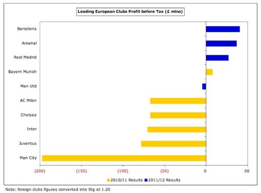 На противоположном фронте клубы, работающие с богатыми инвесторами, сообщают об огромных потерях. £197 миллионов, потерянных боссами Манчестер Сити в сезоне 2010/11 установили новый рекорд в Англии, тогда как Ювентус, Интер, Челси и Милан потеряли около семидесяти миллионов фунтов. Как сказал Газидис, "мы видим, что некоторым клубам тяжело выдерживать ритм финансовых требований современного футбола".