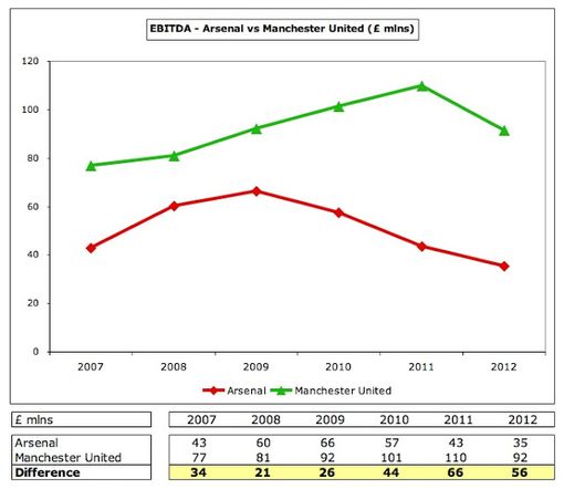 И еще ладно - сам факт продажи футболистов, однако они на самом деле маскируют повышение операционной неэффективности Арсенала. Это можно увидеть в снижении денежной прибыли, известной как EBITDA (прибыль до вычета процентов, налогообложения, износа и амортизации), которая заметно снизилась с отметки в £66 млн в сезоне 2008/09 до цифры в £35 млн в прошлом сезоне. Это все еще довольно неплохие показатели для футбольного клуба, но, чтобы было понятнее, это на 40% меньше, чем у заработавшего £92 миллиона Манчестер Юнайтед.