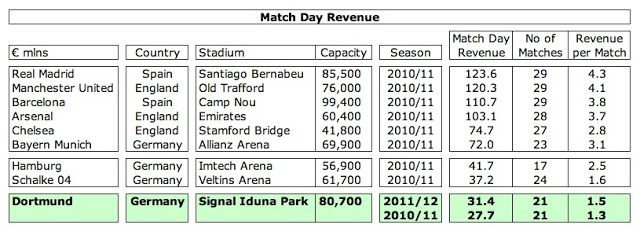 В этом контексте уместно будет сравнение с лондонским Арсеналом, у которого коммерческая деятельность приносит лишь 23% к общему доходу. В то же время, доходы в дни матчей у Канониров составляют 41% суммарного дохода, когда у дортмундцев всего лишь 17%. А посему уместно будет отметить, что большая часть дохода Боруссии генерируется за счет компаний, в то время как Арсенал ориентируется в первую очередь на поступления от фанов.