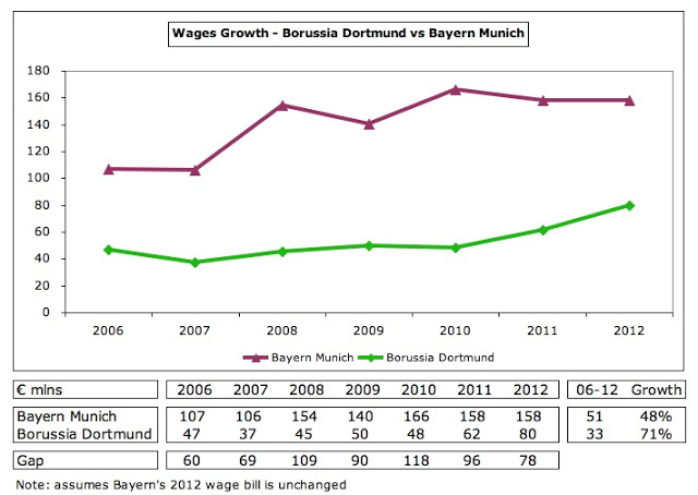 Даже после своего возрастания до 80 млн евро, зарплатная ведомость Боруссии почти в два раза меньше, чем у Баварии (158 млн евро). Хотя разрыв и сократился в сравнении с 2010 годом, когда он составлял 118 млн евро. Но стоит отметить, что доход баварцев значительно больше, что отнюдь не облегчает жизнь дортмундцам.