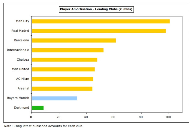 В сравнении с самыми богатыми европейскими клубами ситуация становится еще очевидней - Манчестер Сити, Челси, мадридский Реал и Барселону позволяют себе иметь зарплатную ведомость размером в более чем 200 млн евро. Если же сравнивать эту цифру с английскими клубами, то можно увидеть, что зарплатная ведомость Боруссии равна этой статье расходов таких клубов, как Эвертон, Сандерленд и Фулхэм.