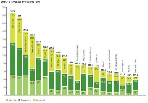 - Единственным новичком рейтинга в этом году стал Ньюкасл Юнайтед. Правда, новым лицом их совсем не назовешь – Сороки выбыли из сего списка всего на три года. Клуб с Сент-Джеймс Парк не может похвастаться большой долей дохода от коммерческой деятельности (13,8 млн евро – худший показатель среди всех клубов), но хороший уровень посещаемости, а главное - поступления от продажи ТВ-прав позволили получить Ньюкаслу дохода на 27 млн евро больше, чем годом ранее. Тем не менее Сороки не сидят сложа руки и по ходу сезона подписали соглашение с компанией Wonga, что поможет увеличить доход по доселе наименьшей его части. В то же время общая сумма дохода коллектива из севера Англии пока находится даже не на уровне 2008 года (тогда она составляла 125 млн евро).