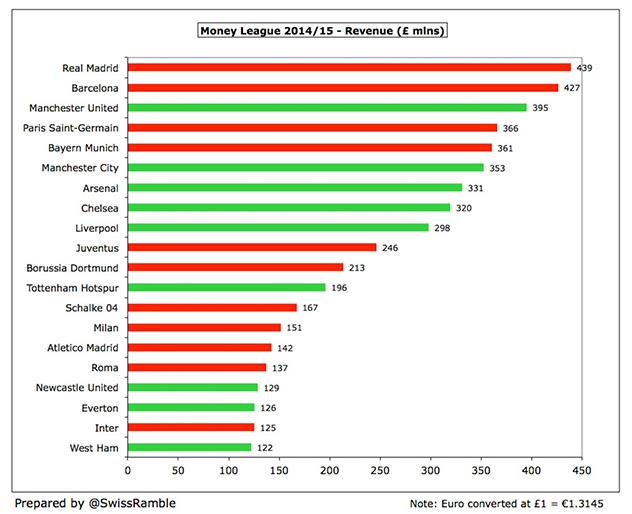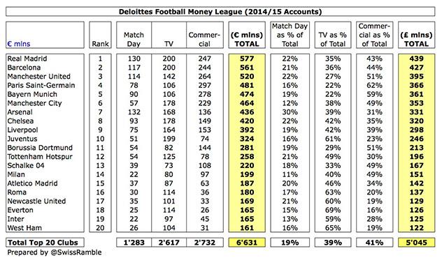 Несколько недель назад Deloitte опубликовала уже девятнадцатый выпуск Футбольной лиги денег — рейтинга ведущих клубов мира по объему доходов — в этот раз за сезон 2014-2015. По сравнению с прошлым годом мало что изменилось: Реал все так же возглавляет таблицу 11-й раз подряд с годовым доходом в 577 млн евро (439 млн фунтов стерлингов); в топ-десятке новых клубов не появилось.