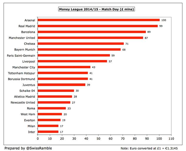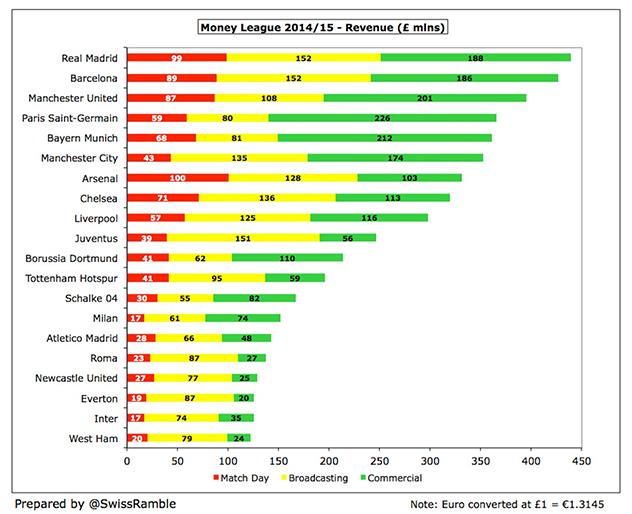 Наименьшая доля дохода от рекламы у Эвертона (16 %), от продажи билетов — у Милана (11 %), от продажи телевизионных прав — у ПСЖ (22 %).