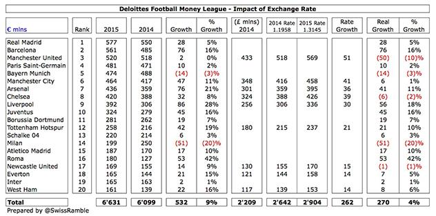 Стоит заметить, что в этом рейтинге немаловажную роль сыграло изменение курса валют: фунт стерлингов вырос относительно евро на 10 % (с 1,1958 в прошлом году до 1,3145 в этом году). Это было на руку клубам из Премьер-лиги, а не их континентальным коллегам. В целом, примерно половина (262 млн евро) из 532 млн роста доходов топ-20 по сравнению с прошлым годом — это результат исключительно изменения курса валют. Реально доходы увеличились на 270 млн евро (4 %).