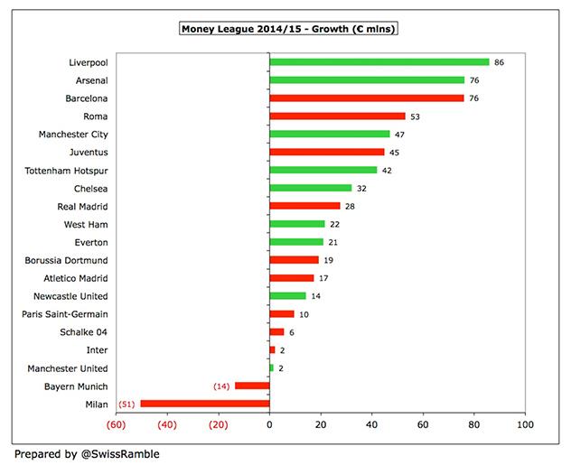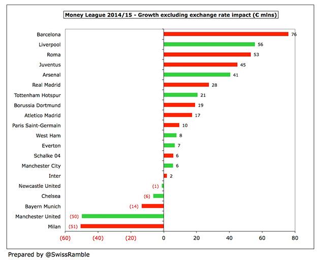 Все английские клубы хотя бы частично обязаны ростом своих доходов изменению курса валют; в этом плане лидируют Ливерпуль (86 млн евро) и Арсенал (76 млн евро).