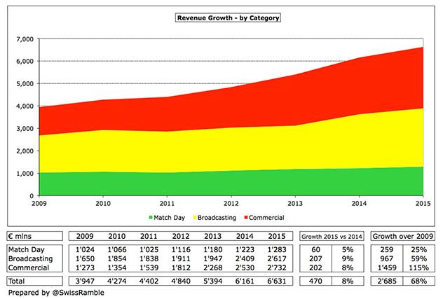 Основными движущими силами увеличения доходов в сезоне 2014-2015 стали телевизионные права — 207 млн евро (9 %) и реклама — 202 млн евро (8 %). Выручка от продажи билетов увеличилась всего на 60 млн евро, но это все равно больше на 5 %, чем в прошлом году.