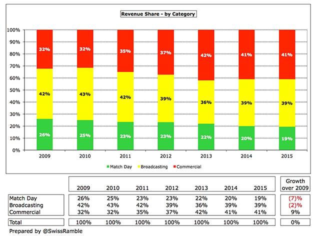 С 2009 года доля выручки за рекламу в общей сумме возросла с 32 % до 41 %, а деньги за телевизионные права теперь составляют не 42 %, а 39 %. Доля денег, полученных от продажи билетов, упала с 26 % до 19 % — самый низкий показатель в истории.