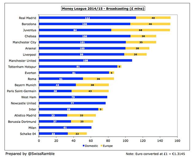 По доходам от продажи телевизионных прав английские клубы занимают все позиции с четвертой по десятую — все благодаря щедрому контракту от Премьер-лиги. А в следующем году телевизионное соглашение увеличит доходы клубов примерно на 50 млн фунтов стерлингов за сезон.