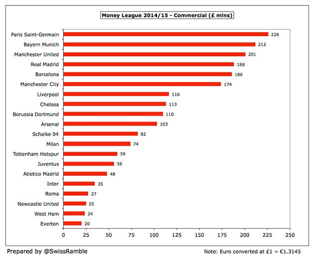 Английским клубам нужно еще поработать над рекламной сферой; трое представителей Премьер-лиги занимают последние места в топ-20: Эвертон — 20 млн фунтов, Вест Хэм — 24 млн фунтов, и Ньюкасл — 25 млн фунтов. ПСЖ пошли на пользу обновленные контракты с Emirates и Nike, но львиная доля их доходов обеспечена инновационной договоренностью с Туристическим управлением Катара. У Барселоны тоже резко выросла выручка от рекламы, отчасти благодаря спонсорским бонусам за выигрыш требла.