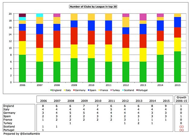 В 2013 году среди топ-20 было всего 6 представителей Премьер-лиги, хотя в 2006-м их было 8. Так что нынешнее доминирование англичан — не новость. Главные неудачники в этом плане — это Германия (в 2009 году в топ-20 было 5 клубов, а теперь — 3) и Франция (в 2012-м было 3 клуба, теперь — всего один).