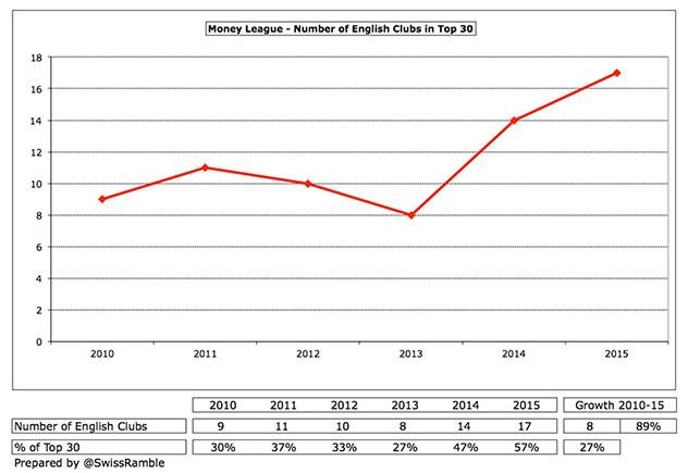 В топ-30 мощь английского чемпионата бросается в глаза еще больше. В 2013 году в первой тридцатке было 8 "англичан"; в 2015-м — их стало 17 (на 3 больше, чем в 2014-м), в том числе три дебютанта — Кристал Пэлас, Лестер Сити и Вест Бромвич Альбион. Это также результат феноменально успешных в финансовом плане телетрансляций Премьер-лиги, доходы от которых делятся между клубами относительно поровну. На международном уровне это дает солидное преимущество клубам, которые не выступают в еврокубках. В результате из топ-30 исчезли такие громкие имена, как Валенсия, Севилья, Гамбург, Штуттгарт, Лацио, Фиорентина, Марсель, Лион, Аякс, ПСВ Эйндховен, Порту, Бенфика и Селтик.