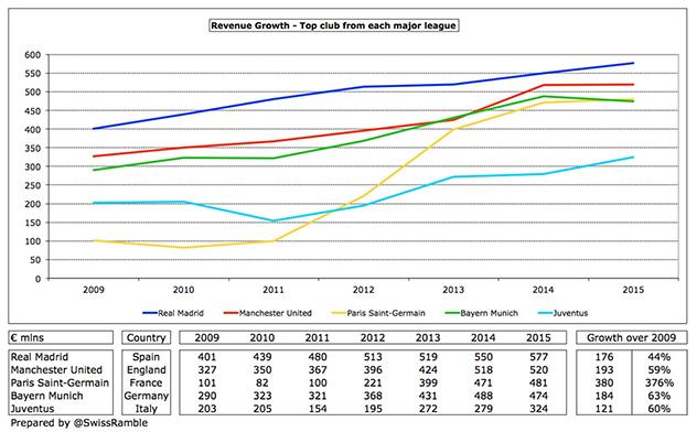 Если взглянуть, на "рост" лучших представителей "Большой пятерки", то с 2009 года доходы мадридского Реала выросли на 176 млн евро, Манчестер Юнайтед — на 193 млн евро, Баварии — на 184 млн евро; это примерно одинаковые суммы. Но если рассматривать этот рост в процентах, то 44 % Сливочных заметно отстают от 59 % Красных дьяволов и 63 % мюнхенского клуба.