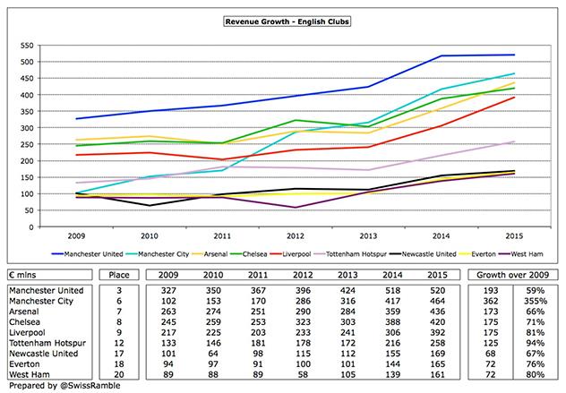 Несмотря на снижение доходов в 2015 году (в фунтах стерлингов), Юнайтед все еще опережает Сити, за которыми следуют Арсенал, Челси и Ливерпуль. Тоттенхэм же застрял между первой пятеркой Премьер-лиги и командами из средней части таблицы. Как выразился однажды Теренс Трент Д'Арби: "Ни рыба, ни мясо".