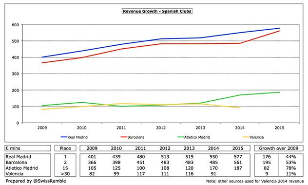 Другие испанские клубы отстают так сильно, что их практически не видно на горизонте: ближайший преследователь — Атлетико Мадрид со 187 млн евро, составляющими лишь третью часть выручки Барселоны. Валенсия даже не пробилась в топ-30, что и не удивительно, ведь их доход в 2014 году составил менее 100 млн евро.