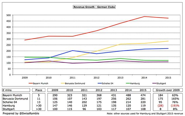 С 2009 года Боруссия не отстает от Баварии по крайней мере в плане роста доходов: 175 млн евро против 184 млн евро. В то же время выручка Шальке увеличилась всего на 95 млн евро, а у Штутгарта и Гамбурга вообще упала, что не в последнюю очередь связано и с низкой успешностью команд в Бундеслиге.