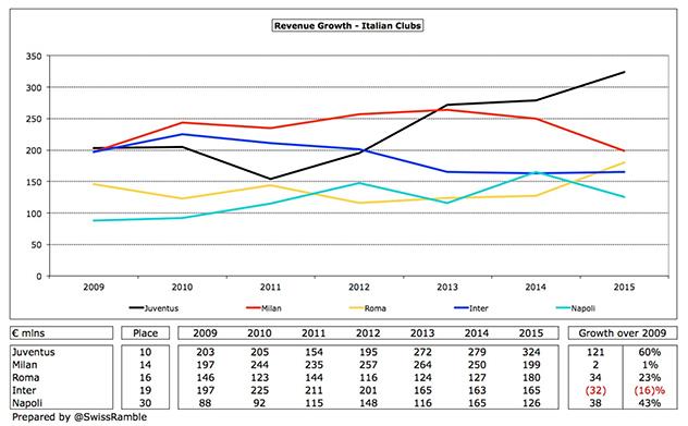Рома может похвастаться неплохим подъемом, в основном благодаря возвращению в Лигу чемпионов в сезоне 2014-2015 — впервые после турнира 2010-2011 года. У Наполи все наоборот — они принимали участие в самом престижном клубном турнире Европы в предыдущем сезоне, хотя неаполитанцам с 2009 года все равно удалось увеличить доходы на 38 млн евро, теперь они составляют 126 млн евро, благодаря чему клуб смог пробиться в топ-30.