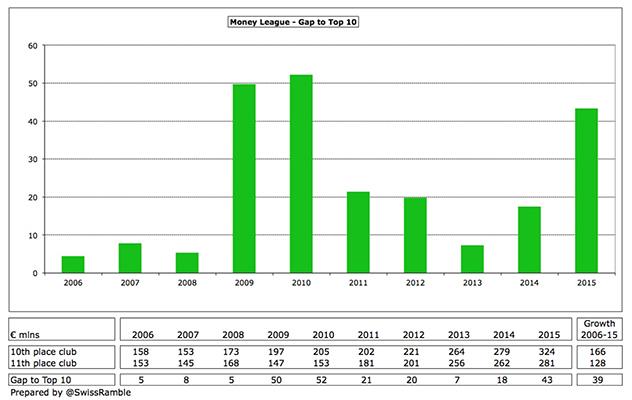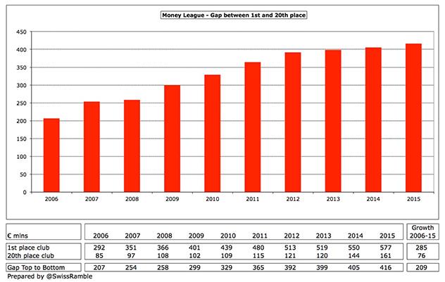 Разница между первым и последним местом (в 20-ке), неуклонно растет. После 207 млн евро 2006 года она почти что удвоилась до 416 млн евро в 2015-м: ошеломляющие 577 млн евро мадридского Реала против скромного 161 млн евро Вест Хэма.