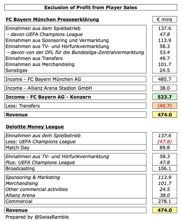 Континентальные клубы часто включают выручку от продажи игроков в общую сумму дохода. Так Бавария в собственном пресс-релизе 2014-2015 года хвастается доходами в 524 млн евро. Разница между этой цифрой и 474 млн евро, указанными в рейтинге Лиги денег, — это как раз 50 млн евро, заработанные на продаже игроков.
