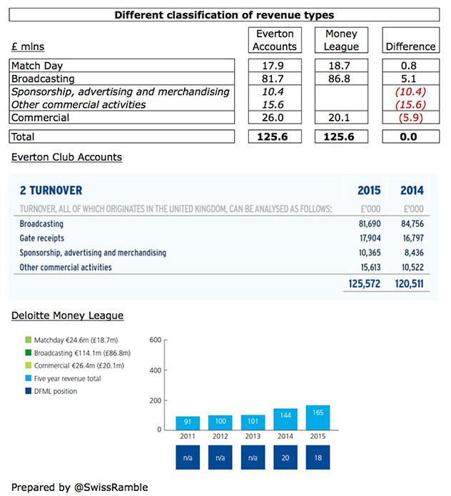 Клубы могут также по-разному классифицировать свои доходы. Например, Эвертон включает рекламный аспект договора о телеправах с Премьер-лигой в графу "Доходы от рекламы", хотя большинство других команд относит это к "Доходам от продажи телевизионных прав". Потому Deloitte и "уменьшила" доходы Эвертона от рекламы, увеличив на ту же сумму доходы от продажи телеправ.