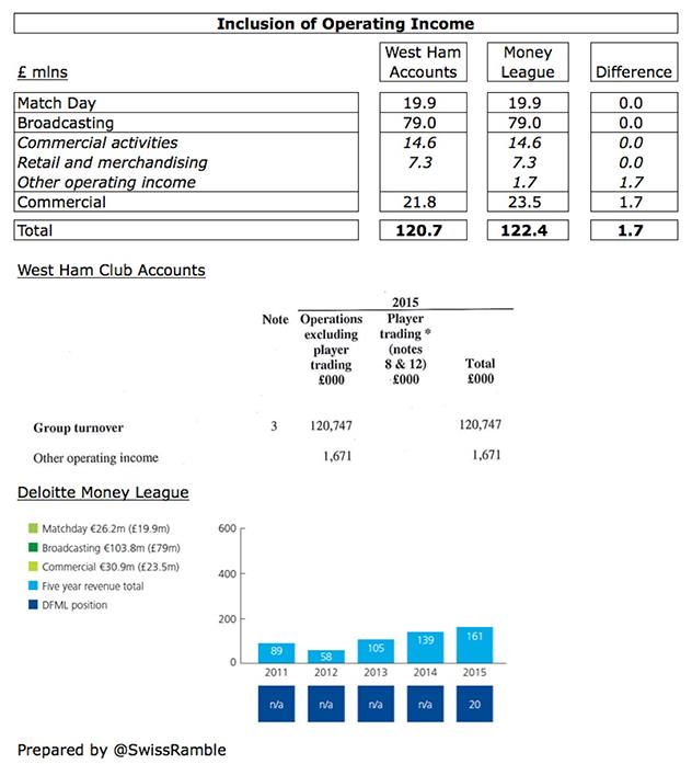 Футбольные клубы обычно отделяют некоммерческие доходы от чистой выручки, классифицируя их как "Другие операционные доходы". Например, Вест Хэм отчитался о чистой выручке в 120,7 млн фунтов, но Deloitte также включила в эту сумму "Другие операционные доходы" Вест Хэма в объеме 1,7 млн фунтов; в итоге получилось 122,4 млн фунтов стерлингов.