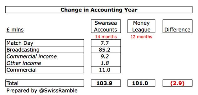 От этого общая сумма доходов особенно не увеличилась, так как в июне и июле не было выручки от продажи билетов или прав на телетрансляцию, но рекламные соглашения все еще действовали. Поэтому Deloitte уменьшила их показатель в сезоне 2014-2015 со 103,9 млн фунтов, указанных в отчете Суонси, до 101,0 млн фунтов.