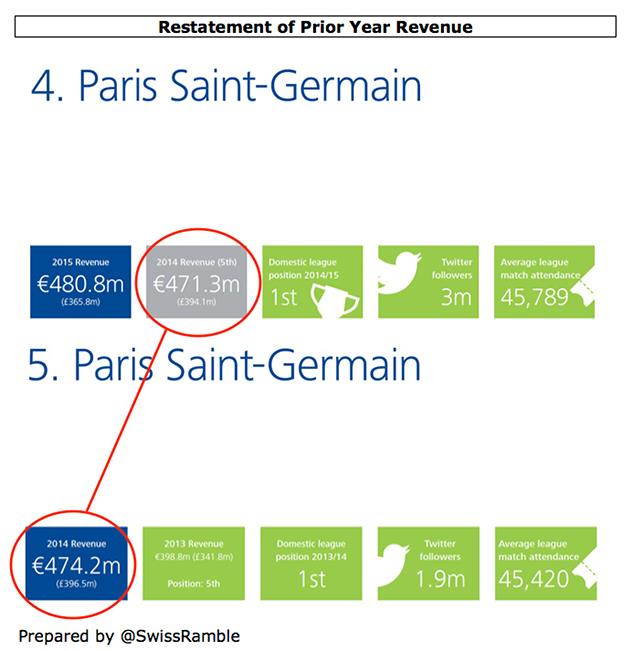 Лига денег иногда пересматривает показатели клубов, указанные в прошлогоднем рейтинге. Например, в прошлом сезоне Deloitte сообщила, что доходы ПСЖ составили 474,2 млн евро, а в нынешнем рейтинге прошлогодний показатель — 471,3 млн евро. Это не влияет на текущий рейтинг, но сказывается на показателях роста (при сравнении доходов последнего и предыдущего сезонов).