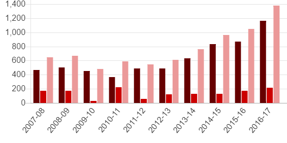 Сравнение расходов на трансферы зимой и летом (темно-красный — летнее трансферное окно, красный — зимнее, розовый — суммарные траты за сезон)